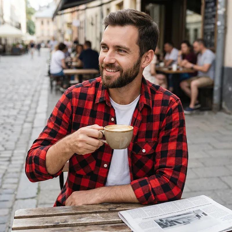 I really like this plaid shirt. Super comfy, fits just right, and keeps me cool even when it's really warm. My friends keep asking where I got it.